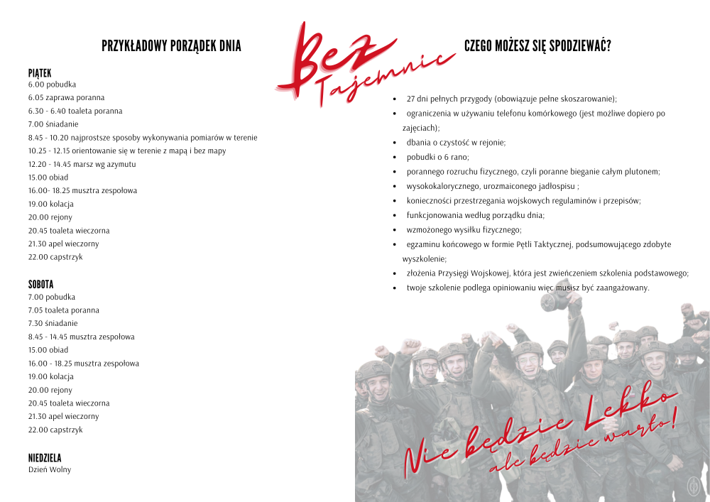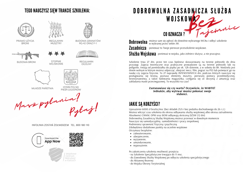 Wojsko Polskie umożliwia pełnienie zaszczytnej służby Ojczyźnie, która daje szansę rozwoju zawodowego oraz sprawdzenia się. Ministerstwo Obrony Narodowej realizuje cyklicznie szereg programów szkoleniowych i edukacyjnych mających na celu zwiększenie zainteresowania służbą wojskową. To programy, które dają szanse przeszkolenia różnym grupom wiekowym obywateli. Celem powyższych szkoleń oraz projektów edukacyjnych MON jest budowanie odporności obywateli i całego Państwa na możliwe zagrożenia, wzmocnienie bezpieczeństwa Polski i jej mieszkańców. To odpowiedź na rosnące wyzwania dotyczące bezpieczeństwa i potrzeby budowania odporności państwa.